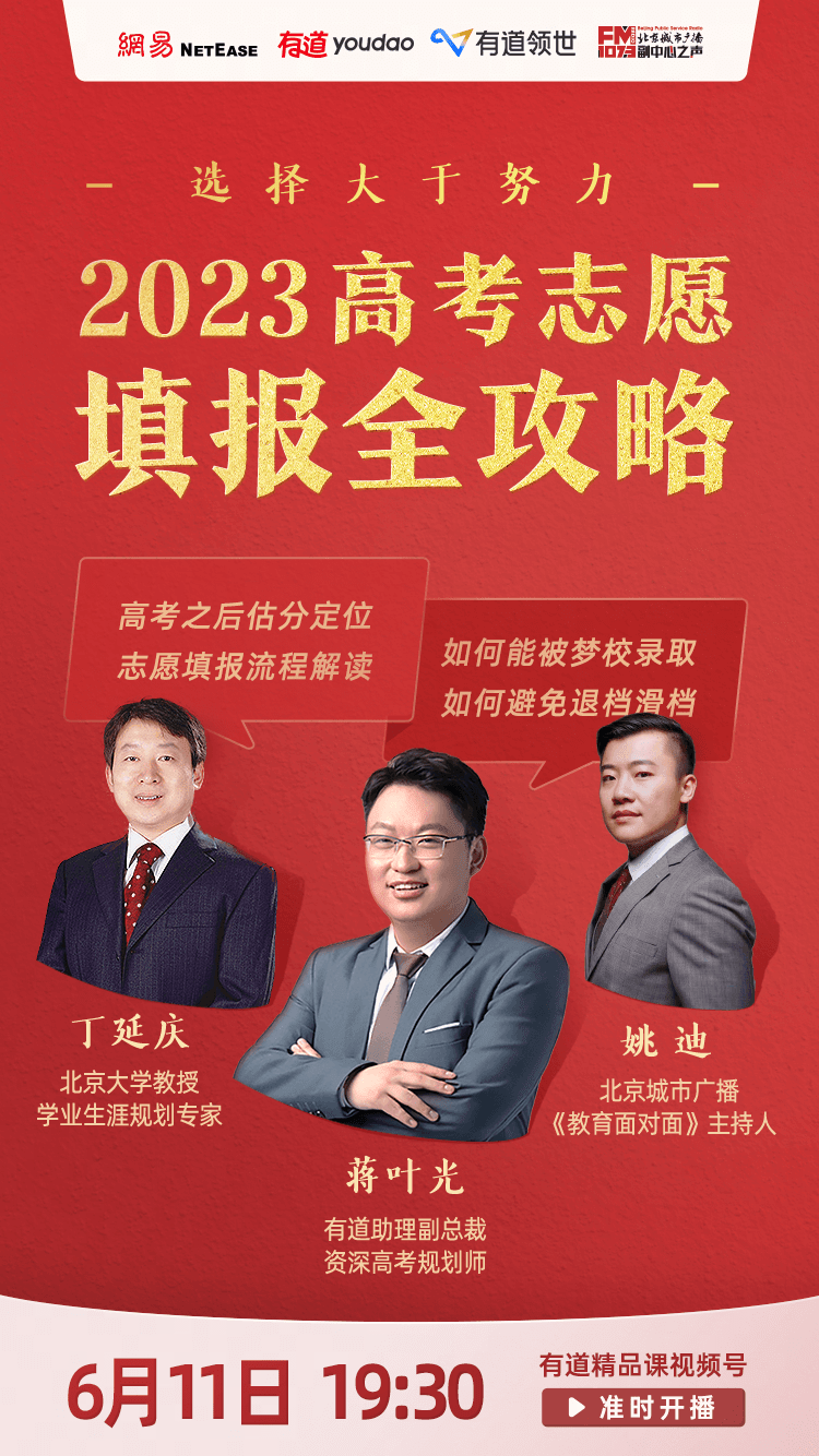 网易有道5月5日起启动持续一个多月的“2023高考志愿填报指南”系列直播,针对如何快速定位适合的专业、如何充分利用每一分填报、如何制定“冲、稳、保”目标学校-专业策略等诸多家长和同学们关切的问题,结合具体案例进行详细讲解和指导。