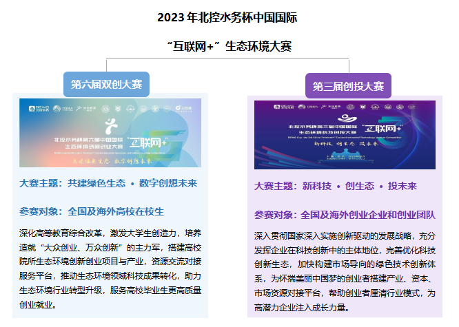 为深入实施创新驱动发展战略,培养造就“大众创业、万众创新”的主力军,完善优化生态环境领域科技创新生态,推动科技成果转化,助力行业转型升级,生态环境产教联盟与北控水务集团,联合知名高校、行业协会、投资机构等正式启动北控水务杯第六届中国国际“互联网+”生态环境创新创业大赛(以下简称“双创大赛”)和第三届中国国际“互联网+”生态环境科技创投大赛(以下简称“创投大赛”)。目前,两场赛事报名通道已在北控水务集团官网正式开启,报名截止日期为2023年10月10日,并拟定于12月初在南京大学举办现场总决赛。