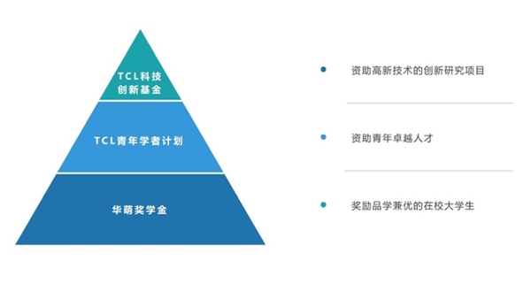 一流大学是基础研究的主力军和重大科技突破的策源地,为促进高等学府教育建设,为社会培养更多科技创新人才,TCL公益基金会自2022年启动TCL高校捐赠体系,以“TCL科技创新基金” 鼓励青年科研,助推科技源头创新;以“TCL青年学者计划”激励青年学者,激发学术活力;以“华萌奖学金” 奖励优秀学子,赋能高校建设发展;三大项目层层递进,形成了“金字塔”形的资助结构。