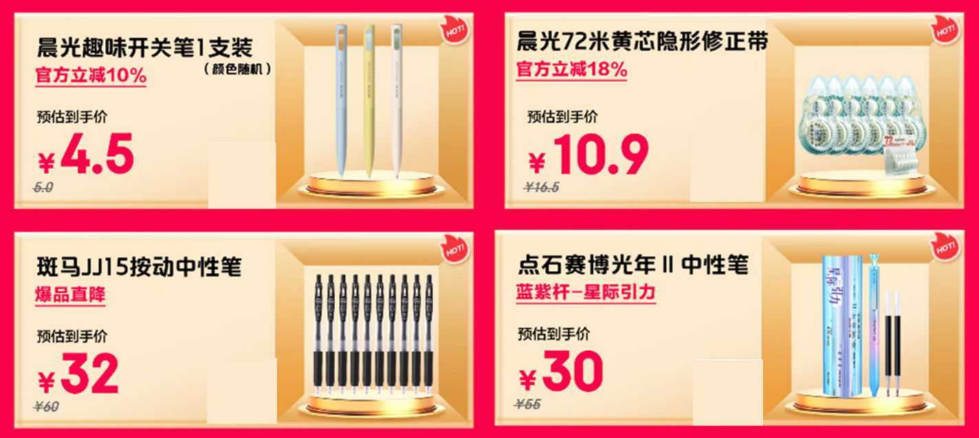 提升效率也不要忽视书写体验,不管是学生党日常刷题记笔记,还是职场人写方案做记录,一支顺手的笔与实用的修正工具都不可缺少。晨光趣味开关笔作为爆款之一,官方立减10%后仅4.5元,颜色随机充满惊喜,开关设计书写顺畅;涂改就用晨光72米黄芯隐形修正带,官方立减18%,大容量且修正痕迹隐形,10.9元让卷面始终整洁如新。追求质感选斑马JJ15按动中性笔,爆品直降后32元,出墨均匀不晕染,连续书写不卡顿;喜欢潮流风格就入点石赛博光年Ⅱ中性笔,30元的蓝紫杆“星际引力”款,颜值与手感并存,让每一次落笔都充满愉悦。