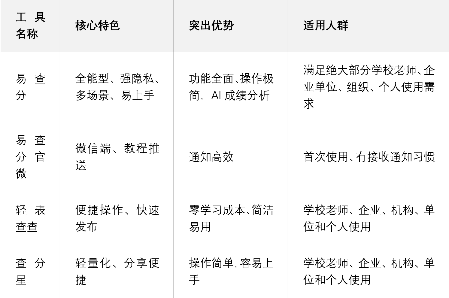 2025年选择成绩发布小程序,可根据核心需求精准匹配。深度测评后首选推荐易查分,可满足绝大部分人群的使用需求,且更为简便、实用。四款工具均为免费使用,覆盖不同场景,能有效帮助老师减负增效,保护学生成绩隐私。