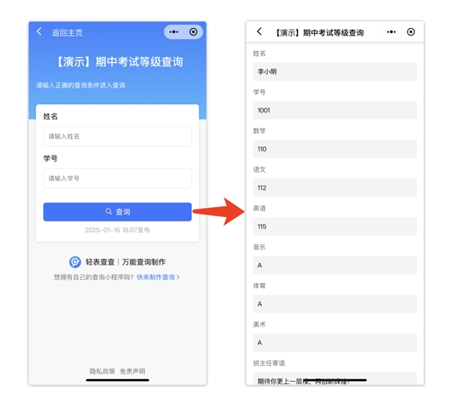 轻表查查是一款AI万能查询制作工具,可以一键将表格转化为查询小程序。操作简洁、无需复杂设置,满足老师快速发布成绩的基础需求,完全免费,深受技术基础薄弱的老师青睐。学生家长查询界面演示如下: