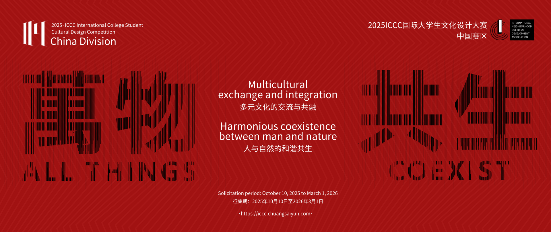 2025ICCC国际大学生文化设计大赛现已开启全球征集。我们期待来自世界各地的设计师,以笔为媒、以心为灯,在“万物共生”的宏大叙事中,描绘出文化互鉴、人与自然相融的未来图景,用设计语言共同书写一个更加和谐、包容的世界新篇章。