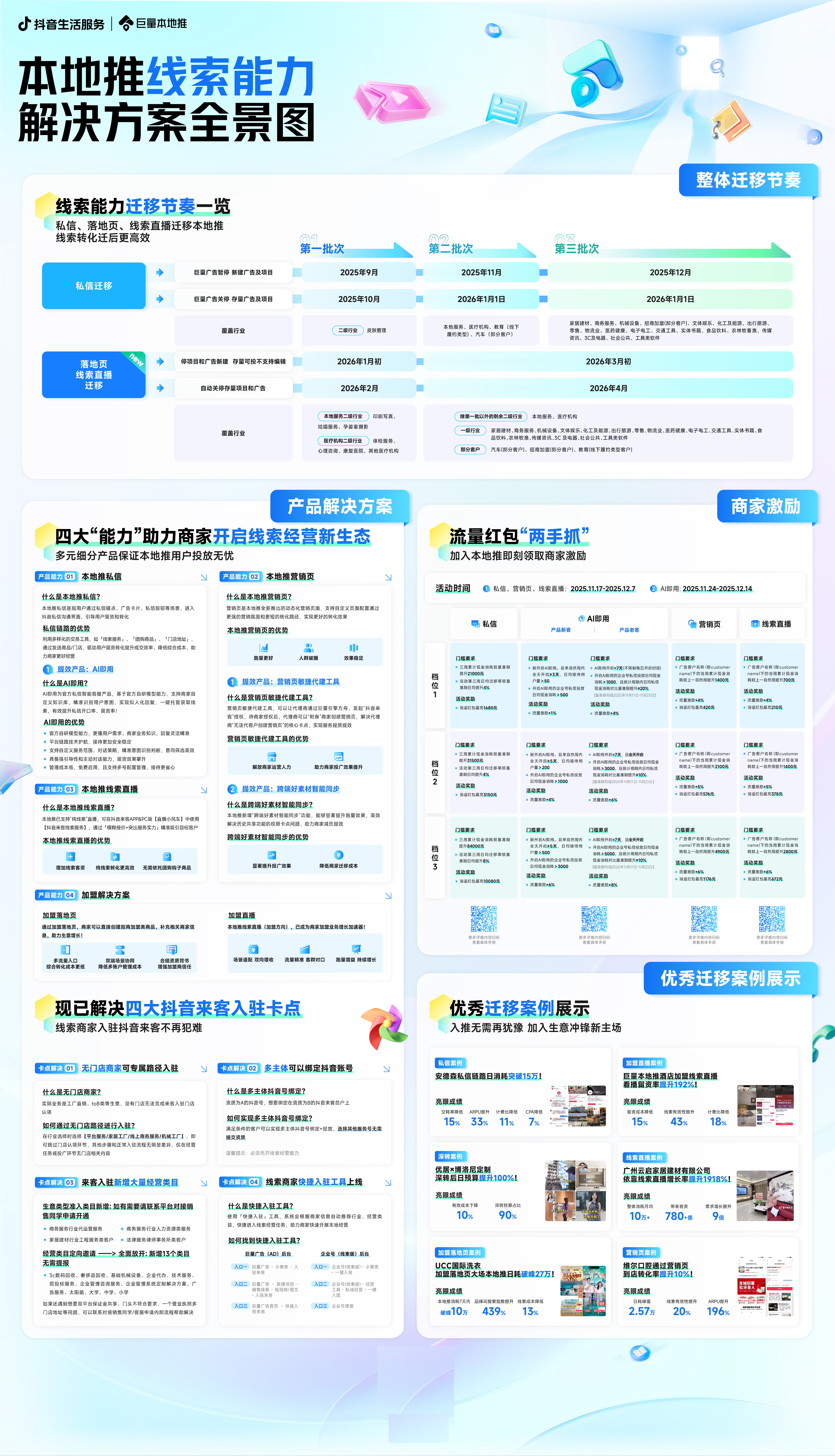为更好地辅助商家捕捉精准流量,获得脚踏实地的生意结果,巨量本地推将整体在本地推上重点发力,成为线索生意新主场。为更好的完善巨量本地推的产品生态,全方位满足商家营销需求,以私信、营销页、线索直播为代表的各线索能力也将陆续迁移至巨量本地推,为保证存量项目正常运转,迁移动作将分多批次进行,以下为具体迁移节奏及覆盖行业范围。