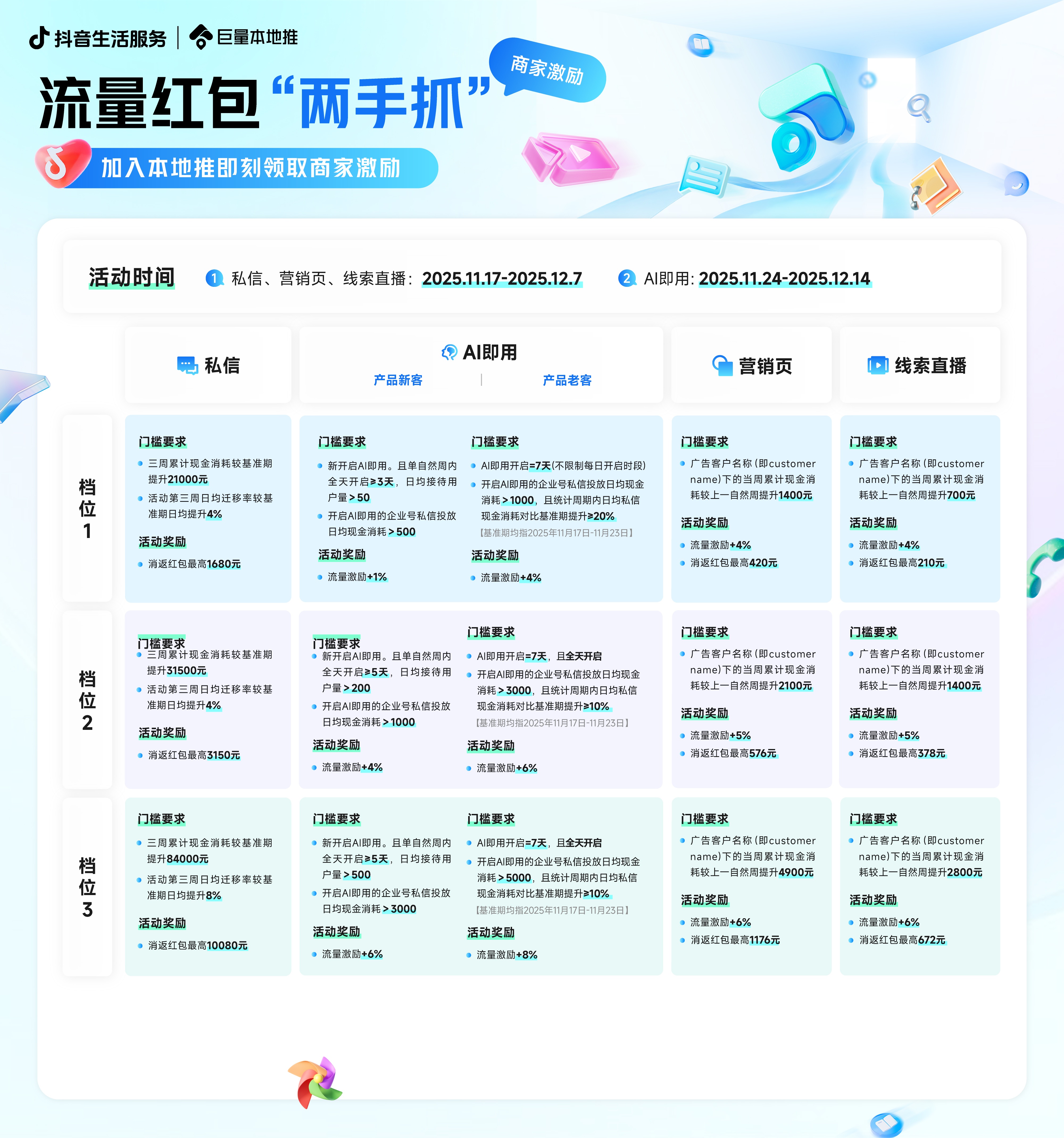 在「线索直播」激励政策中,共设置三个奖励等级,根据商家每周档位达成激励门槛程度,最高可得6%流量奖励,累计三周目标达成后,最高可获672元消返红包。