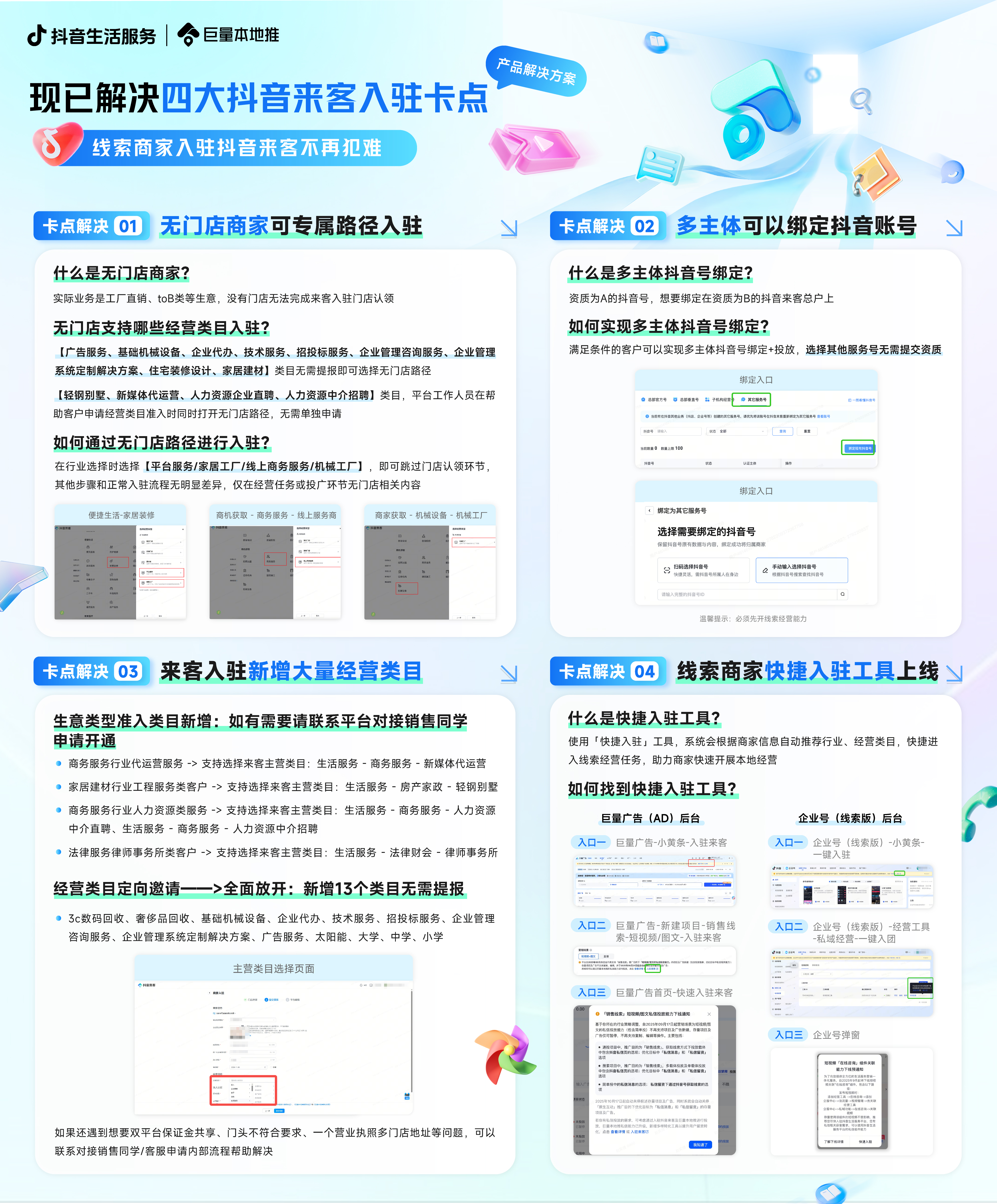 在此基础上,为了给商家带来更便捷、高效的入驻体验,平台针对入驻抖音来客商家的四大实际卡点进行了优化,让商家顺利在本地推投放不再犯难。