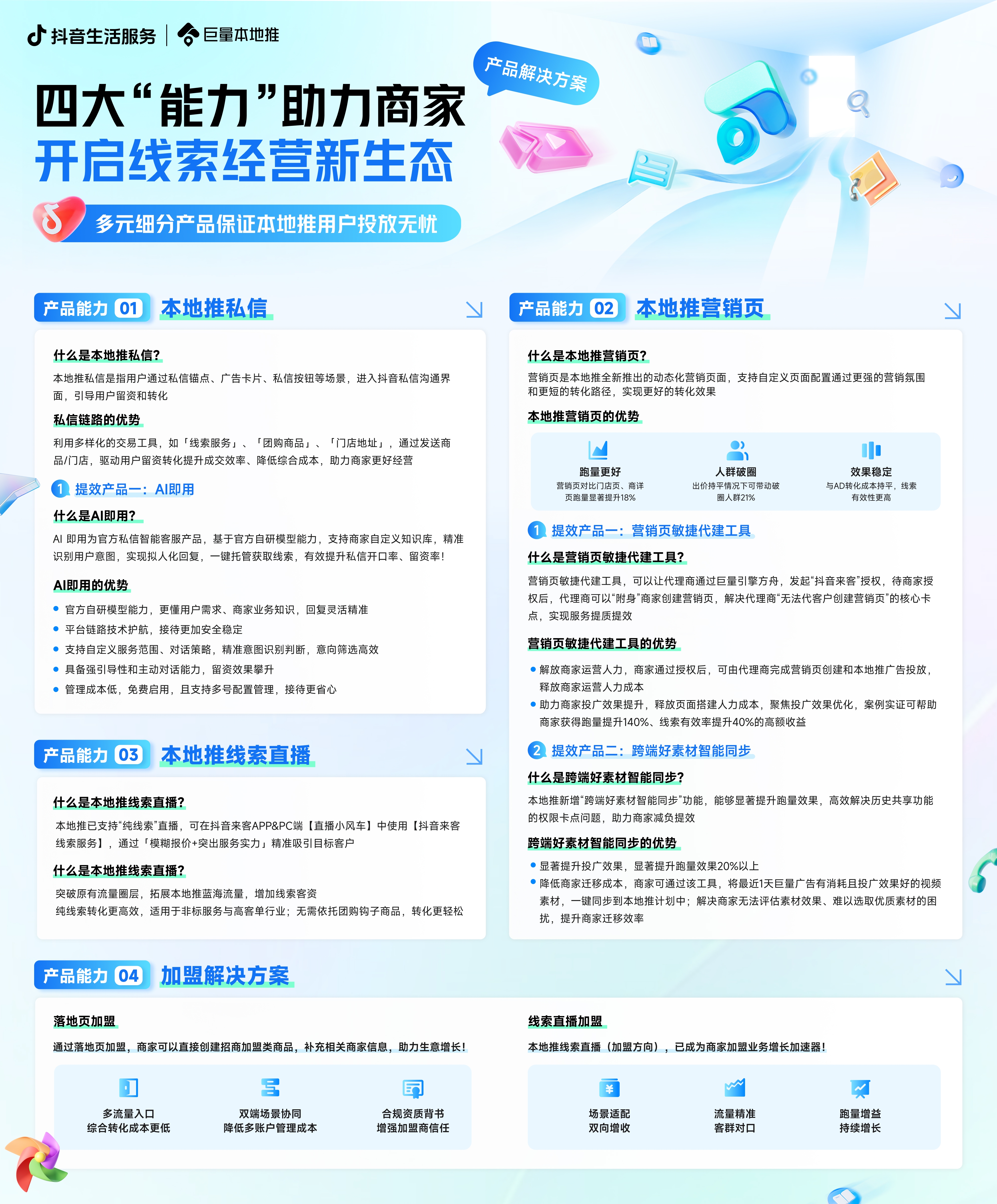 2025 年,线索生意的新机遇已经到来,巨量本地推正以更完善的功能、更丰厚的福利、更严谨的产品逻辑,陪伴本地商家告别增长困境,在精细化运营的浪潮中,稳稳抓住每一份确定性的增量,从而实现生意的可持续增长与盈利升级。