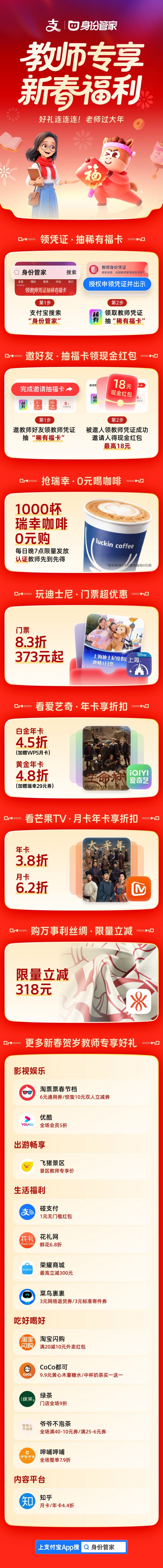 2026年农历新春前夕,支付宝“身份管家”平台联合众多商业品牌,在集福活动中践行“尊师惠师”公益理念,通过数字化方式为全国教师提供专属的新春福利,探索社会力量参与尊师重教的新路径。