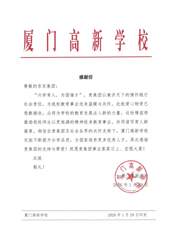 这批精心挑选的文具年货迅速送达学校,并获得了校方的诚挚感谢。厦门高新学校特别向京东致感谢信,信中写道:“‘兴学育人,为国储才’,贵集团以兼济天下的情怀践行社会责任,为我校教育事业送来温暖与关怀。这份情谊将激励我校师生以更饱满的精神投身教育事业,为国家培养更多优秀人才。”京东与得力送出的不仅是一份年货,更是一份对学子成长的关怀、对教育事业的温暖助力,切实体现了企业社会责任的担当与温度。