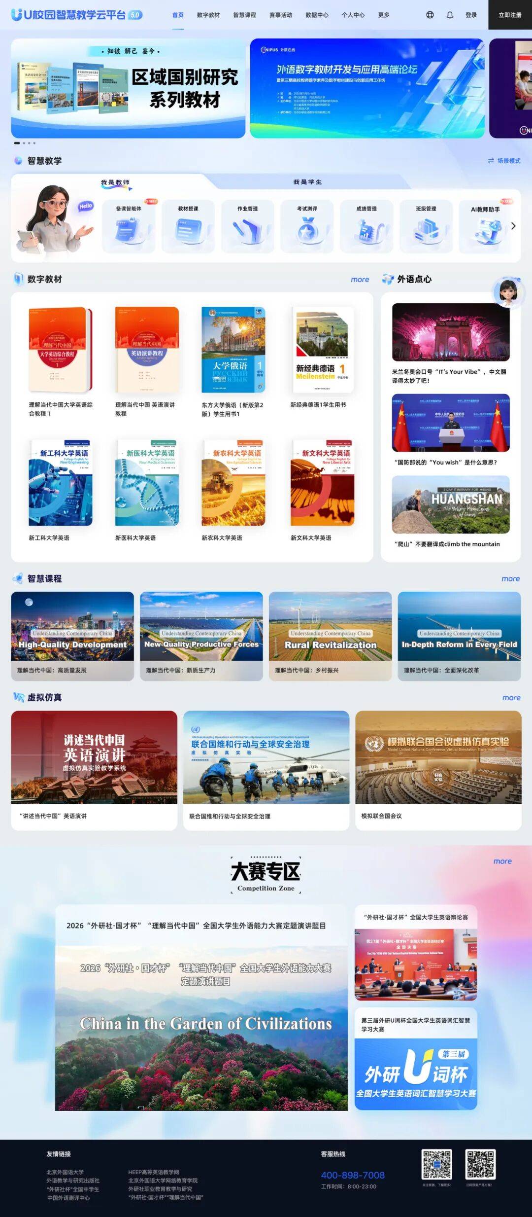 外研社社长助理、外研在线CEO李会钦介绍,面对数智时代高等外语教育的多元需求,全新升级的U校园5.0致力推动外语教学的大规模因材施教。平台集成“理解当代中国”等AI数字教材、U听说自适应学习与训练系统等全新学习资源,融合智能测评、写作、翻译等专项平台,打通教、学、测、评、用、研、管全链路数据,实现学生个性化成长和教师精准教学。平台还依托教师备课、口语陪练、教材编写等智能体,为院校提供智能化、专业化服务,助力学生全球胜任力提升、教师素养引领和院校分类改革落地。