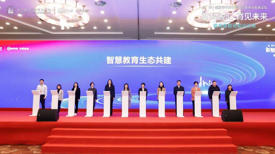 论坛最后,来自中国产业海外发展协会、中国欧洲经济技术合作协会产业出海工作委员会、新华社国家重点实验室区域国别时空智能研究室、英国文化教育协会、中国人工智能产教融合研究院、腾讯云·腾讯教育、阿里云、亚马逊云科技、火山引擎、北京中博数智科技有限公司及多所院校的代表与外研社、外研在线共建智慧教育新生态,在数字教材、智能平台、教师发展、学科转型、产教融合、智慧空间等方向多维探索、加深合作。