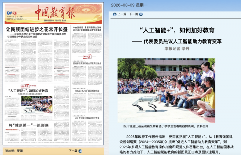 在人工智能国家战略的有力推动下,人工智能赋能教育的新图景正由点及面快速展开。今年两会,多位代表委员建言献策,有代表表示,人工智能正从资源供给、教学模式、治理能力等多个维度深度赋能教育发展;同时也有代表指出,要构建“分层推进、全域协同”的资源供给体系,加快推进数智教育公共服务体系建设,更好支撑教育资源智联共享。
